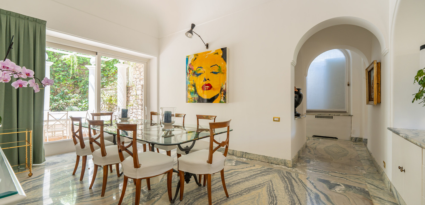 The villa boasts five elegantly styled bedrooms, each featuring air conditioning and a private television, ensuring restful nights and modern convenience. Designed in authentic Caprese style, the interiors are enriched by arched vaulted ceilings and beautifully crafted ceramic tiles, capturing the timeless charm of the island.