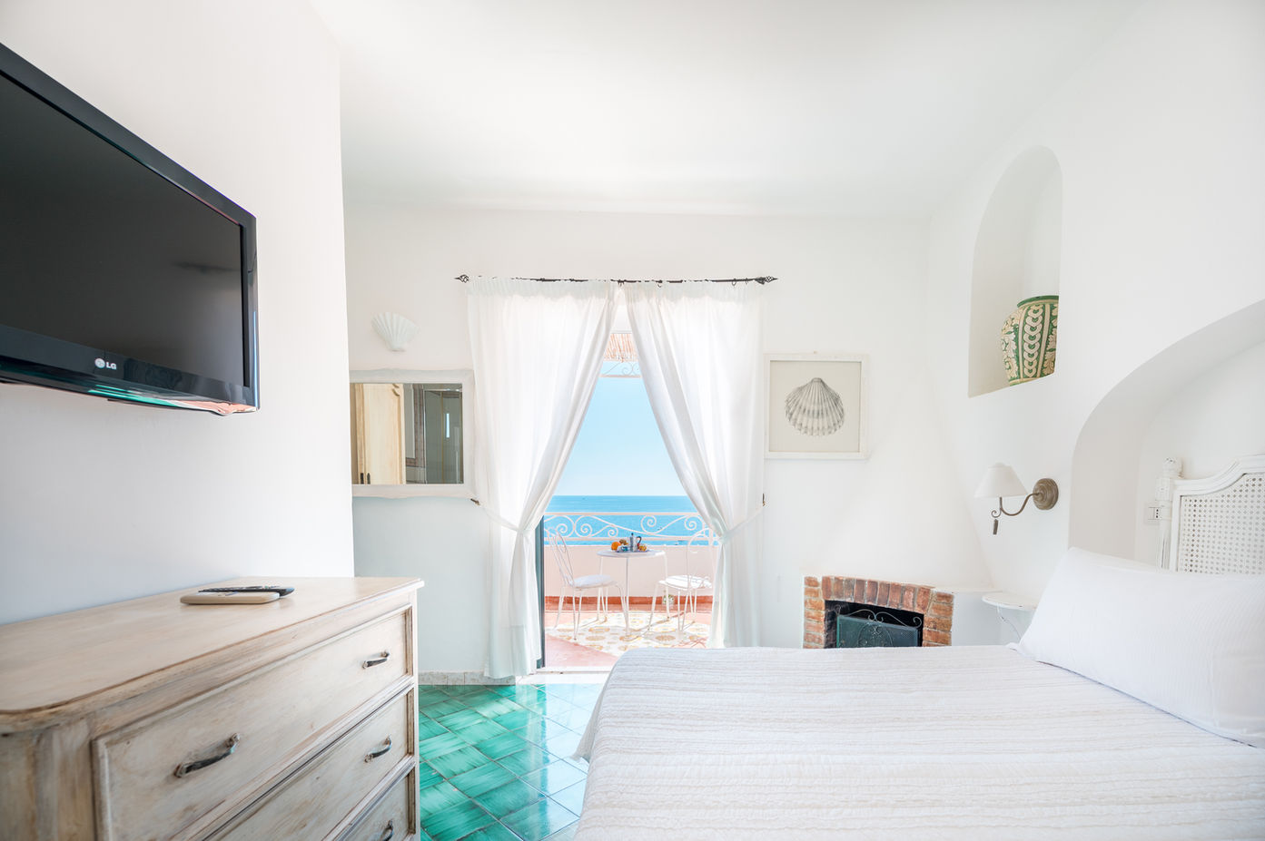 Inside, the villa combines classic Amalfi Coast charm with modern elegance, boasting high ceilings, intricate ceramic tiles, and fresh whitewashed walls. The spacious living area flows effortlessly onto the terrace, blending indoor and outdoor spaces for a seamless experience.